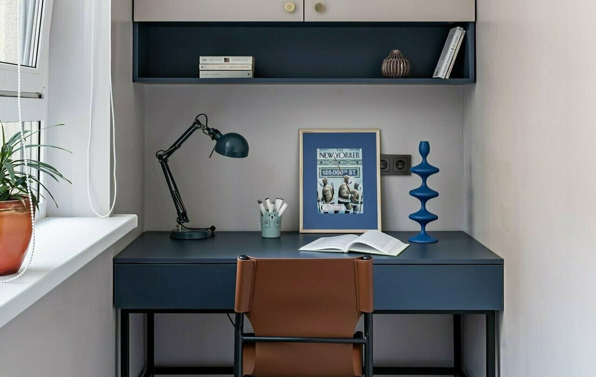 В нашей двухкомнатной квартире мы решили дать вторую жизнь длинной, но узкой лоджии (6 метров в длину и всего 1 метр в ширину). Выходит она из гостиной, а второе окно принадлежит детской. Было бы неразумно не использовать такие дополнительные метры, поэтому мы с мужем приняли решение обустроить здесь два полноценных рабочих места: компьютерный стол для него и стол для моих рукодельных и рабочих задач.