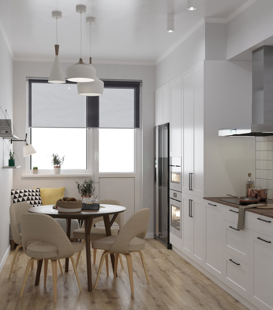 Фасады кухонного гарнитура — от IKEA, имеют легкий кремовый оттенок. Столешница изготовлена из массива дерева, а ее цвет практически идентичен оттенку дубового пола в других комнатах. Точечные светильники с белой прозрачной керамикой привезены из Италии, а смеситель выбран марки Timo. Стоит отметить, что фотографии сделаны вечером — при дневном свете пространство выглядит еще светлее и просторнее.