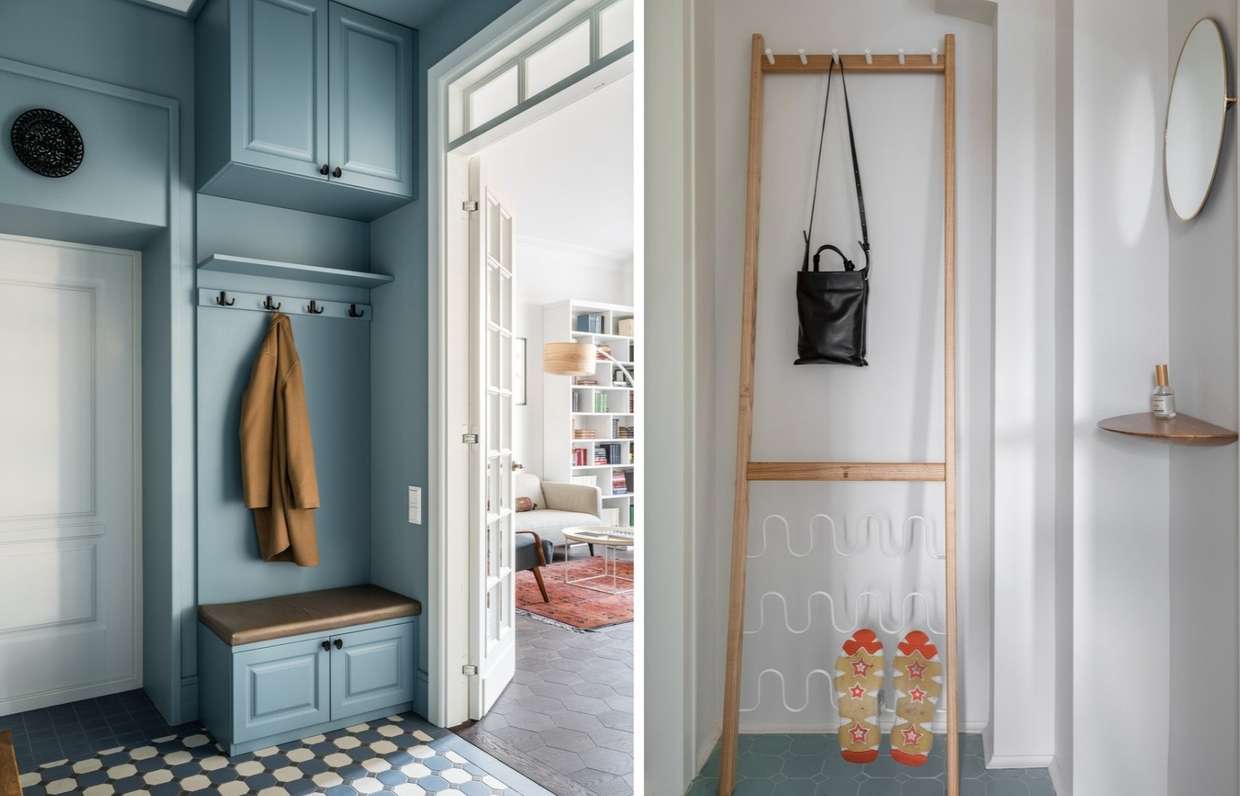 Если позволяет площадь, установите скамейку — она незаменима при надевании обуви, а её внутреннее пространство можно использовать для хранения.