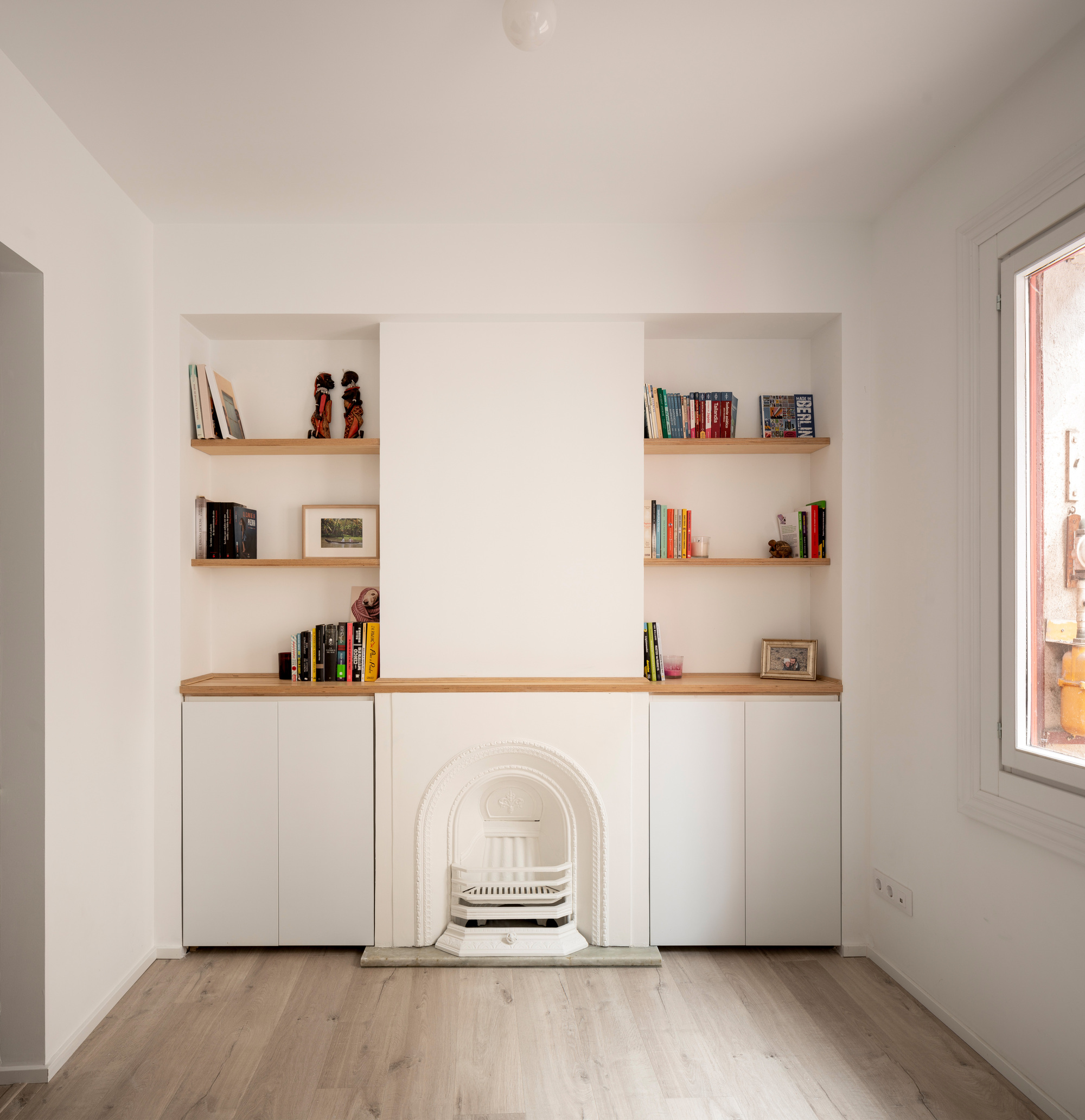 Главная комната квартиры — это воплощение легкости и элегантности. Белоснежные стены и светлый паркет, уложенный узором «елочка», создают нейтральную и чистую основу. Такой подход, часто ассоциирующийся со скандинавской эстетикой, здесь работает на контрасте с испанским солнцем, выступая идеальным фоном для ярких деталей.