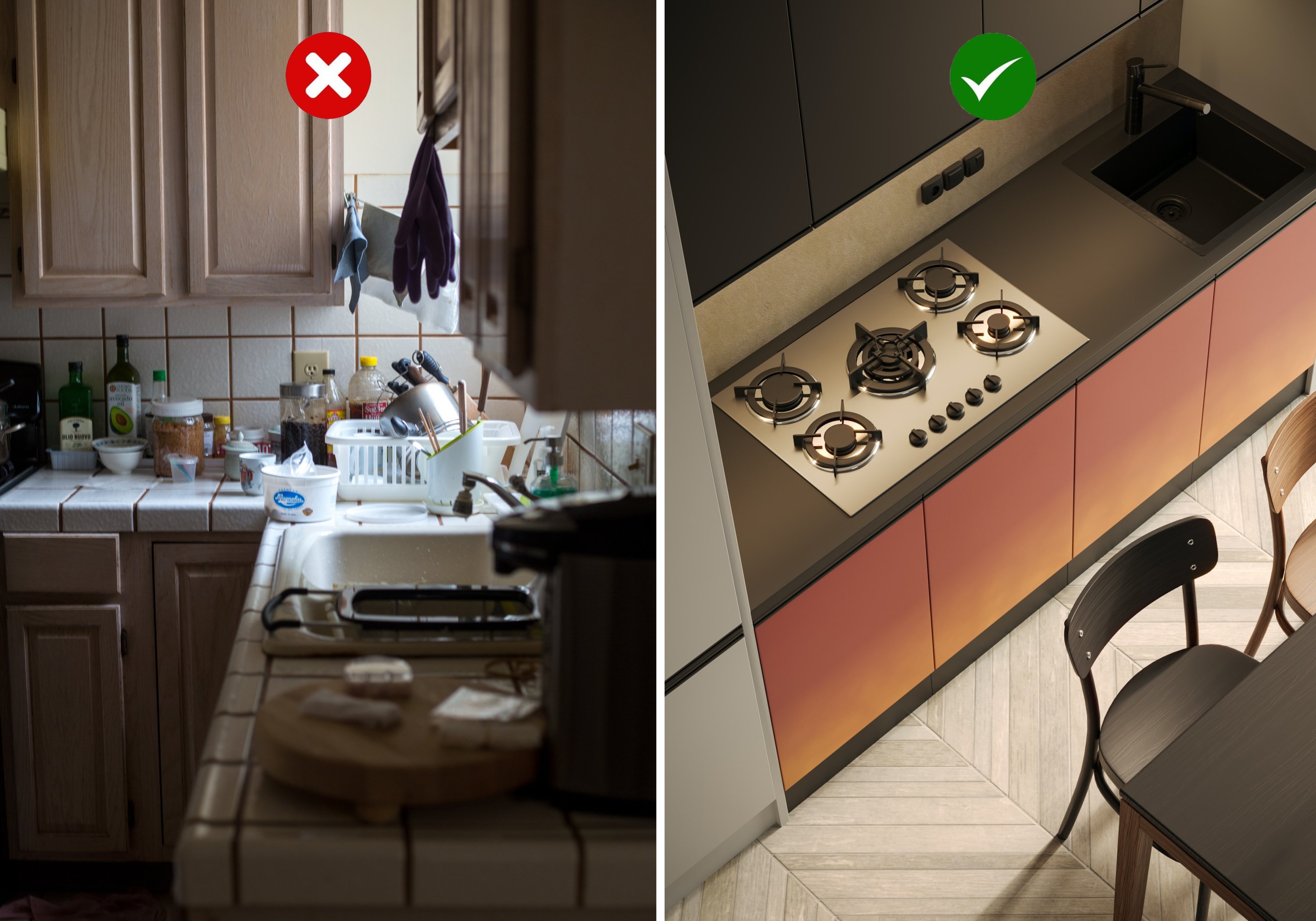 Столешница, заставленная бытовой техникой, банками и мелочами, визуально утяжеляет пространство и создаёт ощущение хаоса. Для поддержания чистоты и порядка рекомендуется оставлять на виду только самые необходимые предметы, которые используются ежедневно, например, чайник или тостер. Всё остальное лучше хранить в шкафах.