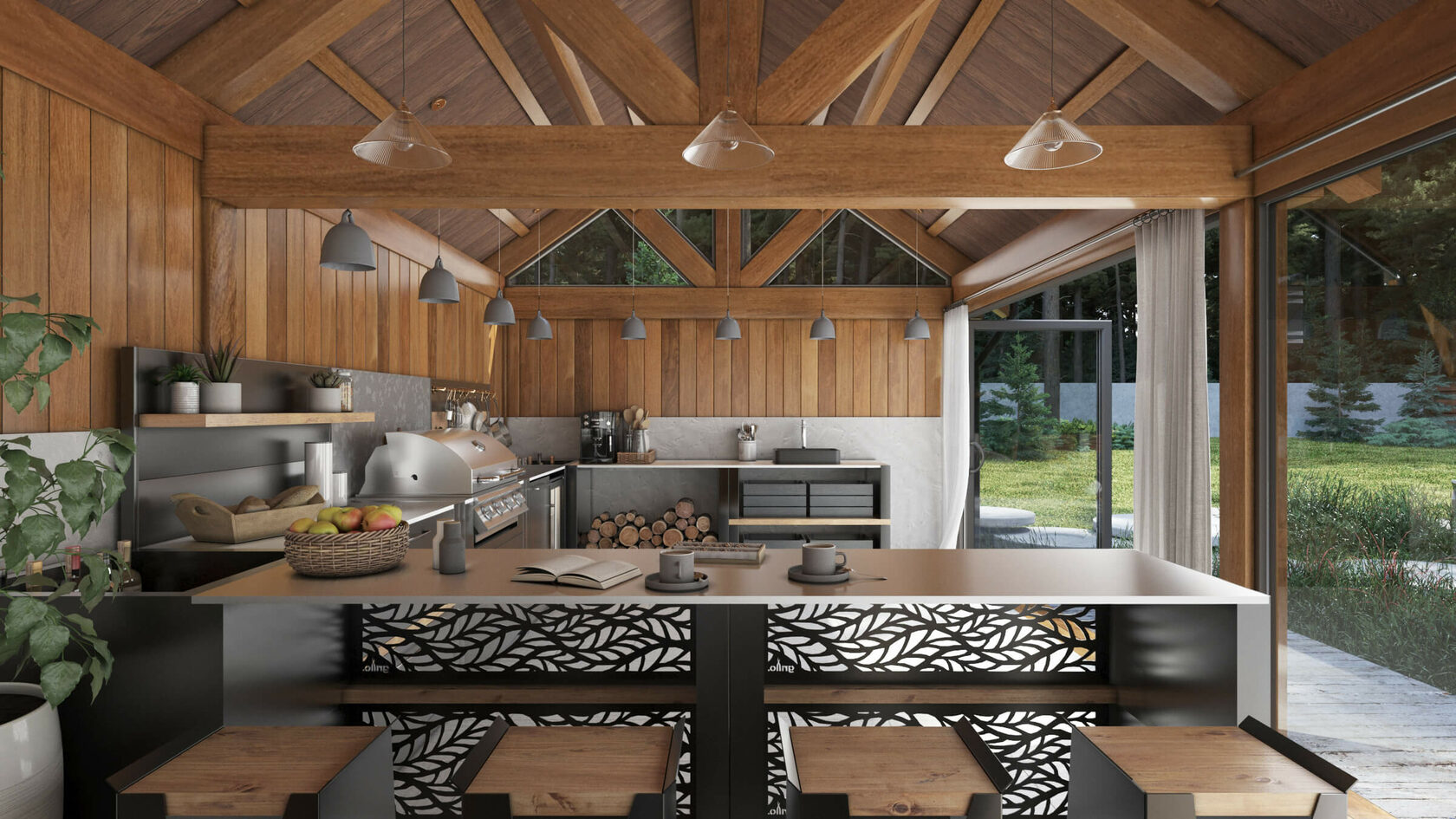 Этот проект служит отличным источником вдохновения для тех, кто хочет обустроить у себя загородную зону для гостеприимства. Давайте детально рассмотрим этот привлекательный пример, где летняя кухня гармонично объединена с гостиной в уютном деревенском стиле.