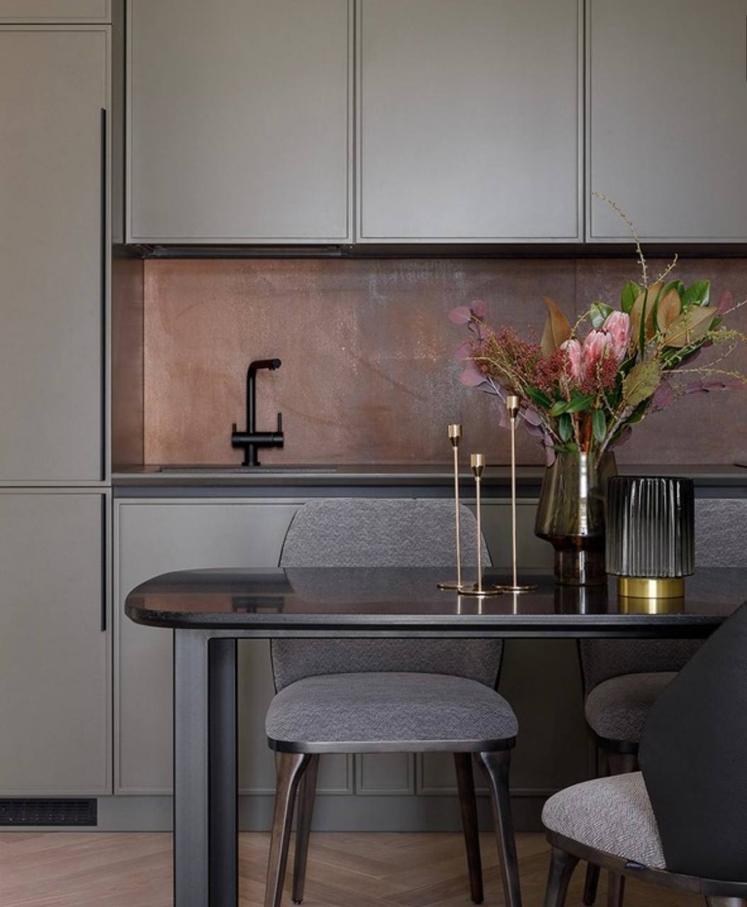 Чёткие линии, углы и абстрактные фигуры — идеальный выбор для кухни в стиле минимализм или модерн. Геометричный орнамент создаёт динамичный, но гармоничный ритм, делая пространство визуально интереснее.