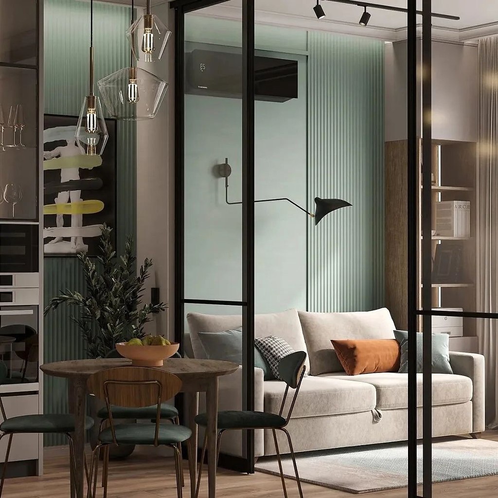 Границы кухни-студии выделяют перегородками. Хорошо подойдут перегородки, изготовленные из гипсокартона, пеноблоков, стекла. Они не займут много места в маленькой комнате. Низкие перегородки подчеркнут распределение функциональных зон. Для маленькой кухни-студии, как на фото, лучше использовать перегородки-купе. Занимают мало места, при этом выполняют сразу несколько функций: закрыв двери-купе, вы изолируете помещения, создав две раздельных комнаты, в открытом состоянии можно разместить на перегородке интересные по фактуре панно.