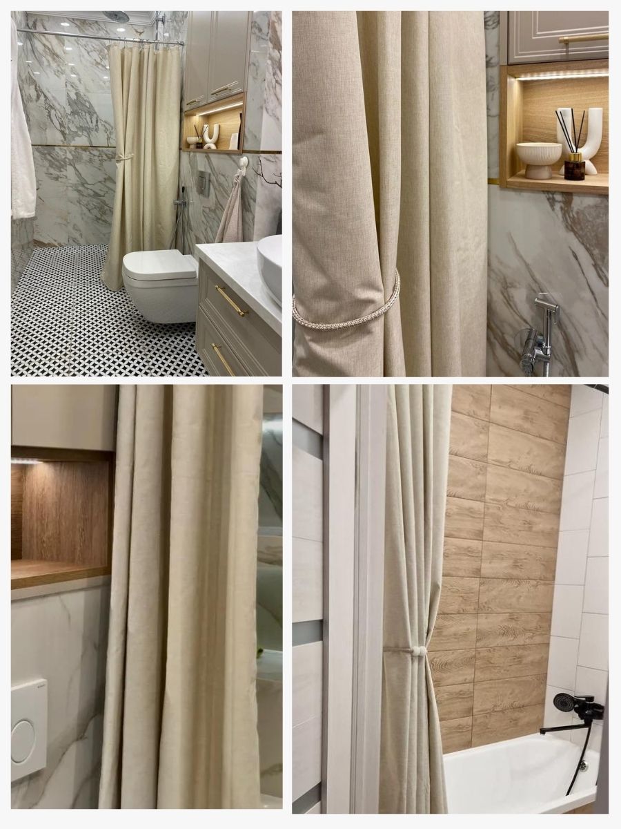 Даже обычная тканевая штора способна преобразить атмосферу в ванной комнате, добавив уюта и цвета. Главное условие — выбирать текстиль со специальной влагоотталкивающей пропиткой. Чаще всего текстильные шторы делают комбинированными: одна сторона — прорезиненная для защиты от воды, а другая — декоративная, из приятной на ощупь ткани. Таким образом, правильный выбор занавески — это удачное сочетание практичности, безопасности и дизайна, который задаёт тон всему интерьеру.