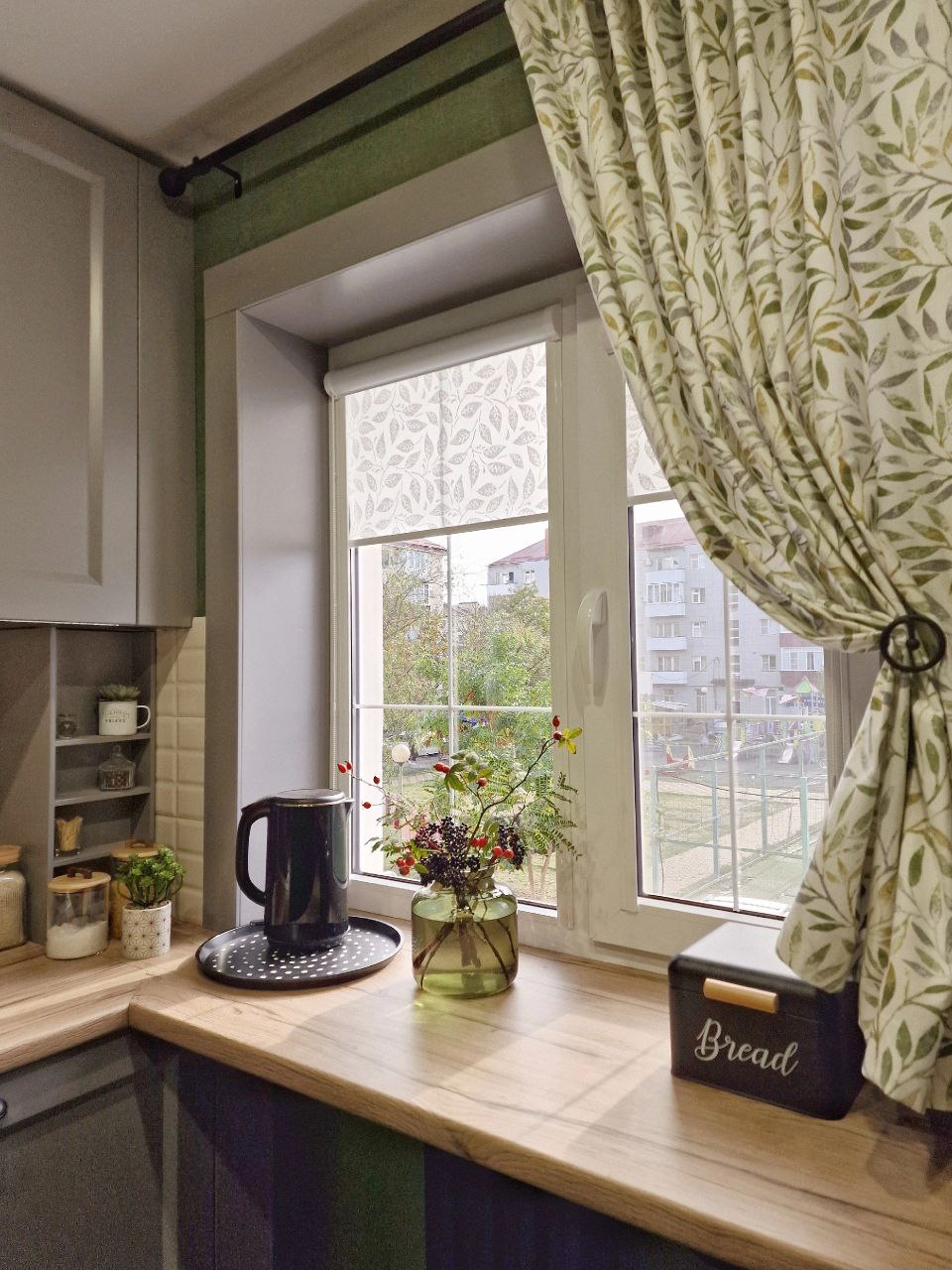 С их помощью корректируют геометрию помещения, добавляя ему высоты или расширяя пространство. Увеличить размер окна можно, применив карниз с длиной, превышающей ширину проема. Получается композиция, которая закрывает часть стены, в результате чего окно кажется шире.