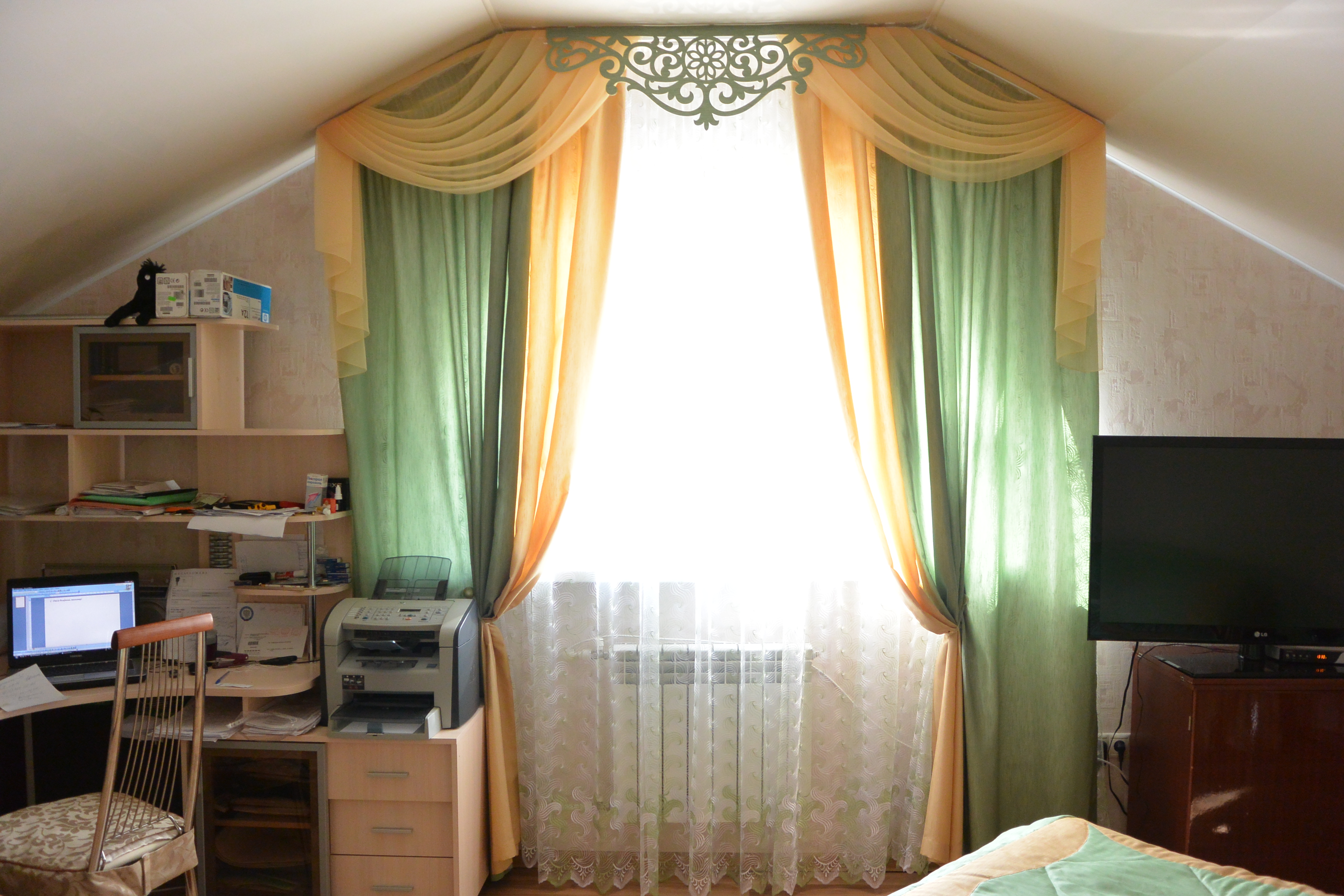 Ламбрекен для спальни размещают поверх штор, крепят на карнизную планку, наклеивают на багет или вешают на дополнительный карниз. Выбор подходящей модели всегда зависит от назначения комнаты, формы окна и фантазии дизайнера.