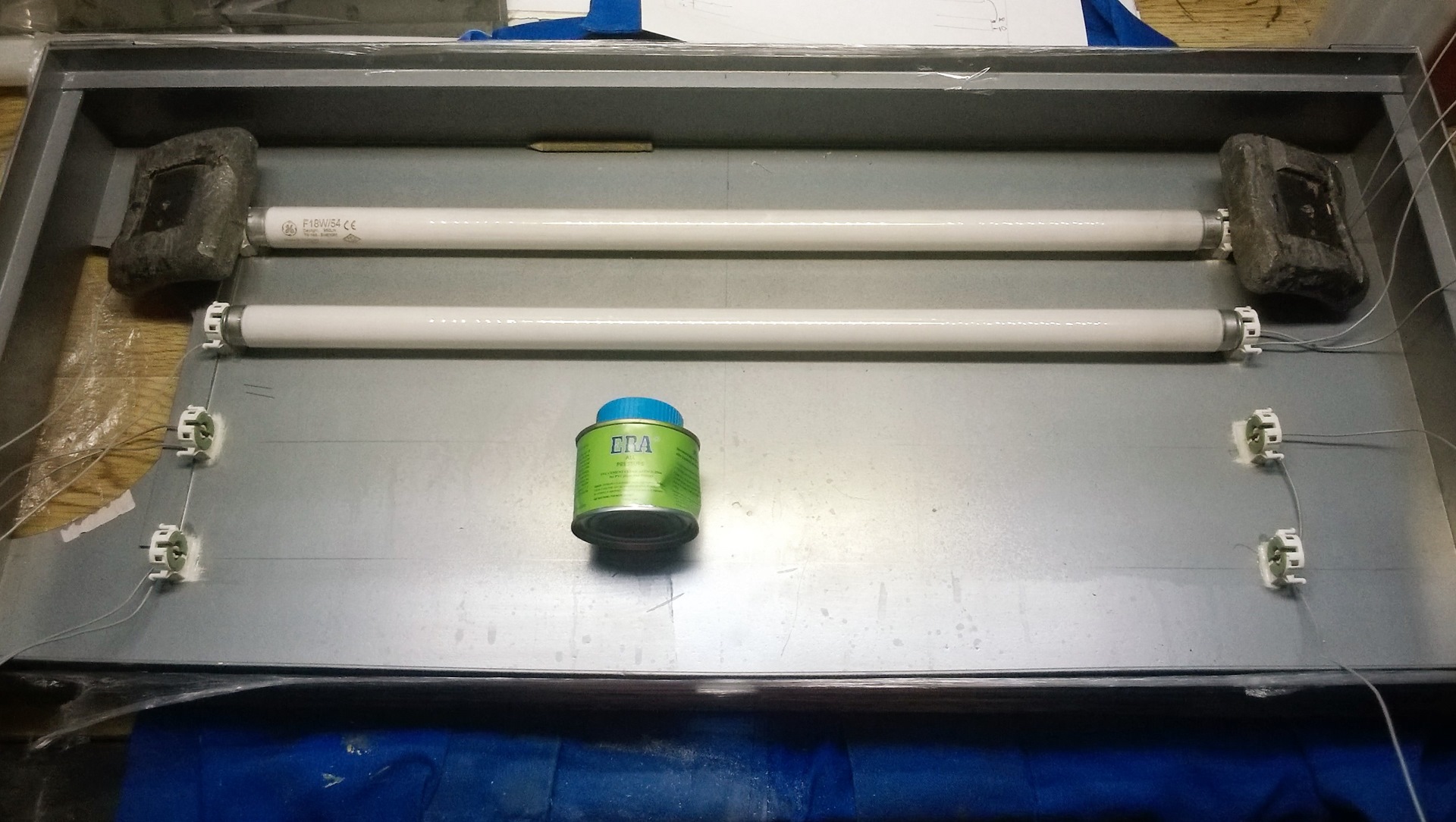 - Сборка корпуса: К нижней части каркаса с помощью подходящего клея крепится прямоугольник из оргстекла. Наверх устанавливается пластиковая крышка, на которой закреплены лампы и пусковое устройство. Эта крышка должна легко сниматься для проведения любых работ.