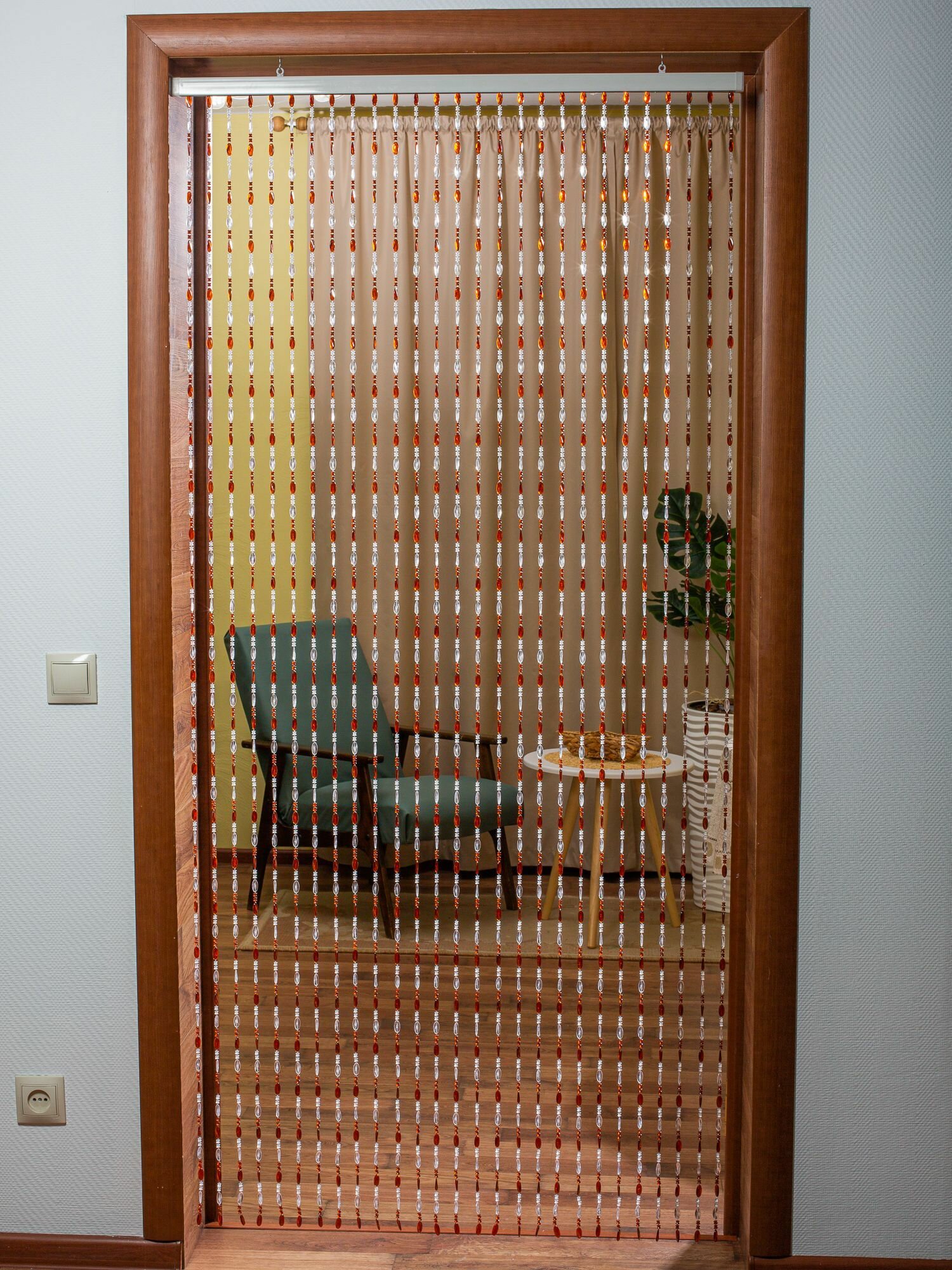 Каждая нить вьетнамской шторы собрана из коротких бамбуковых трубочек небольшого диаметра, нанизанных на леску или проволоку. Между собой элементы нити соединяются за счет миниатюрных крючков или узелков, формируя необходимую длину. Собранные нитки крепятся к планке-основе, которая будет установлена в дверной проем, нижняя часть шторы при этом никак не фиксируется, что делает конструкцию максимально легкой, подвижной и мобильной. Именно такие вьетнамские шторы были очень популярны 25-30 лет назад, но и сегодня мода на них вновь вернулась.