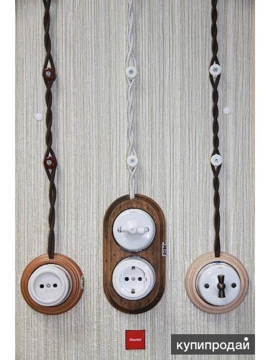 Для устройства ретро-проводки необходим специальный витой шнур и изоляторы (ролики). Остальные составляющие — распаечные коробки, выключатели и розетки для экономии можно взять обычные пластиковые. Важно чтобы они отвечали требованиям: у них должны быть задние стенки из негорючих материалов. То есть можно брать те, которые разрешено монтировать на сгораемые стены.