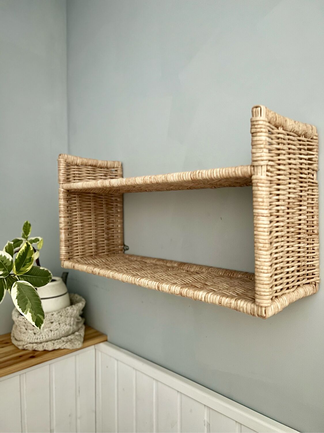 Эта элегантная навесная полка, представленная в фотографиях, сочетает в себе практичность и декоративность. Её ширина рассчитана так, чтобы вместить четыре стандартные консервные банки, которые, после удаления этикеток, превращаются в стильные контейнеры для хранения мелочей. Полка также идеально подходит для размещения небольших горшков с комнатными растениями, создавая мини-садик на стене. Конструкция, прикреплённая к стене шурупами через все петли каркаса, отличается высокой надёжностью и способна выдерживать существенный вес. Дополнительный шарм изделию придаёт крошечная корзинка, изготовленная из миниатюрного проволочного ситечка.
