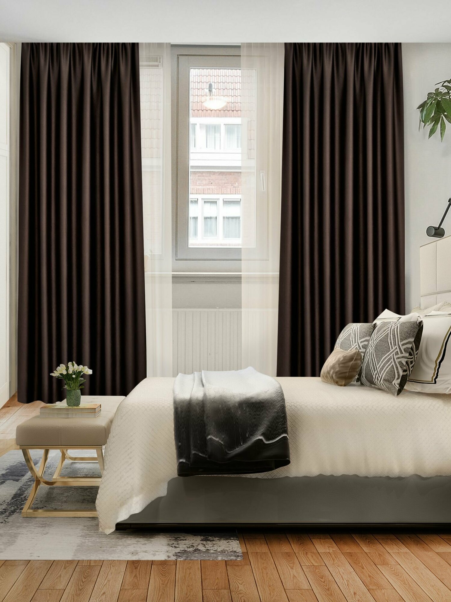 В спальне гармонизируют пространство занавесы из мягких тканей средней плотности и приглушенных оттенков.