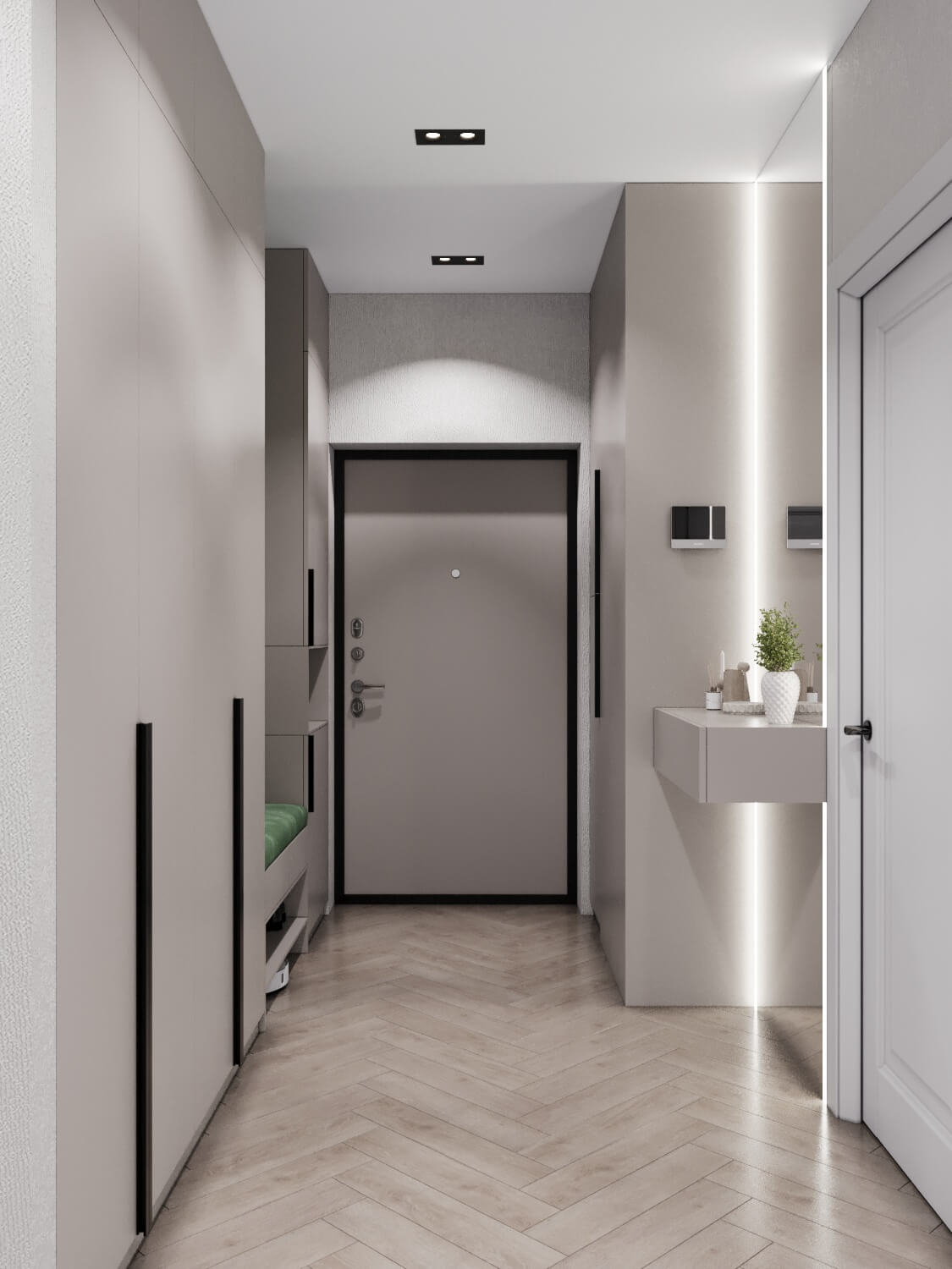 Ошибочно думать, что прихожая в стиле минимализм — это пустое помещение. Напротив, здесь важен продуманный функционал. Это пространство логично продолжает общую стилистику жилища. Идеальным решением для хранения станет шкаф-купе с раздвижными дверцами, которые могут быть зеркальными — это добавит света и глубины. Небольшая настенная полка для ключей и мелочей поможет поддерживать порядок. Важно предусмотреть дополнительное освещение в зоне переодевания, например, встроенные светильники или бра.