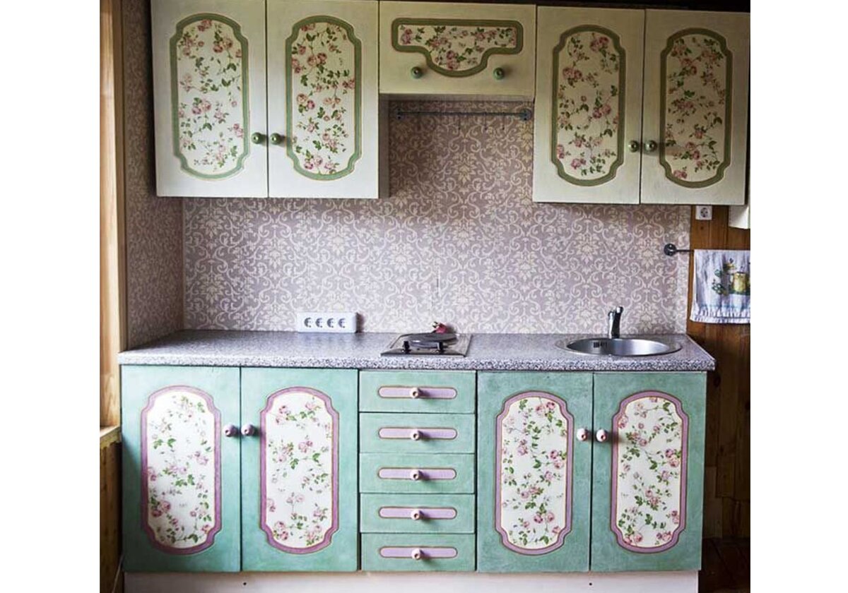 Чтобы оклеить пластиковый (либо деревянный) гарнитур, вам потребуются ламинированные фотообои на самоклеющейся основе — они успешно сопротивляются износу и влажности. Алгоритм поклейки не отличается от нанесения плёнки — заготовки выравниваются по ширине, устраняются воздушные пузырьки. Если же в дело идут бумажные обои, их придётся защитить двойным лаковым покрытием.