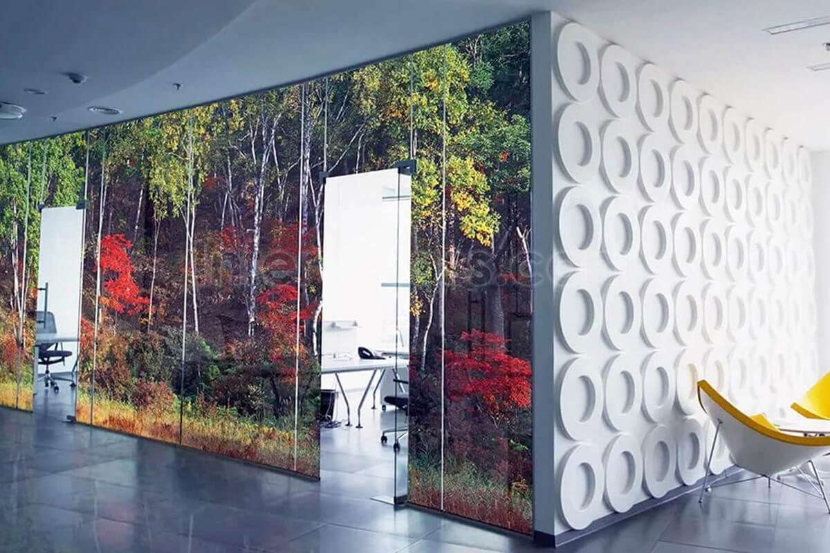 Еще один способ применения – дверца, за которой находится бар, сейф, сигнализация и прочее. Обычно это фотопанели из стекла в виде картин. В помещении обычно устанавливают несколько таких изделий, что смотрится гармонично и стильно.