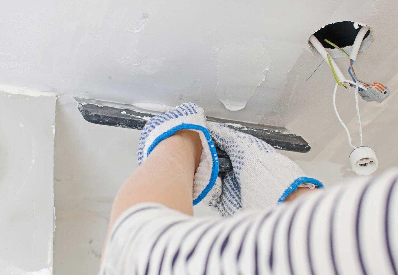 Шпаклевка — это финишный материал, который позволяет устранить мелкие дефекты поверхности, такие как трещины, сколы и перепады до 5 см. Технология шпаклевания потолка практически идентична работе со стенами, поэтому освоив этот процесс, вы сможете применять его в разных ситуациях. Шпаклевать можно как старую, так и новую штукатурку, а также гипсокартонные поверхности.