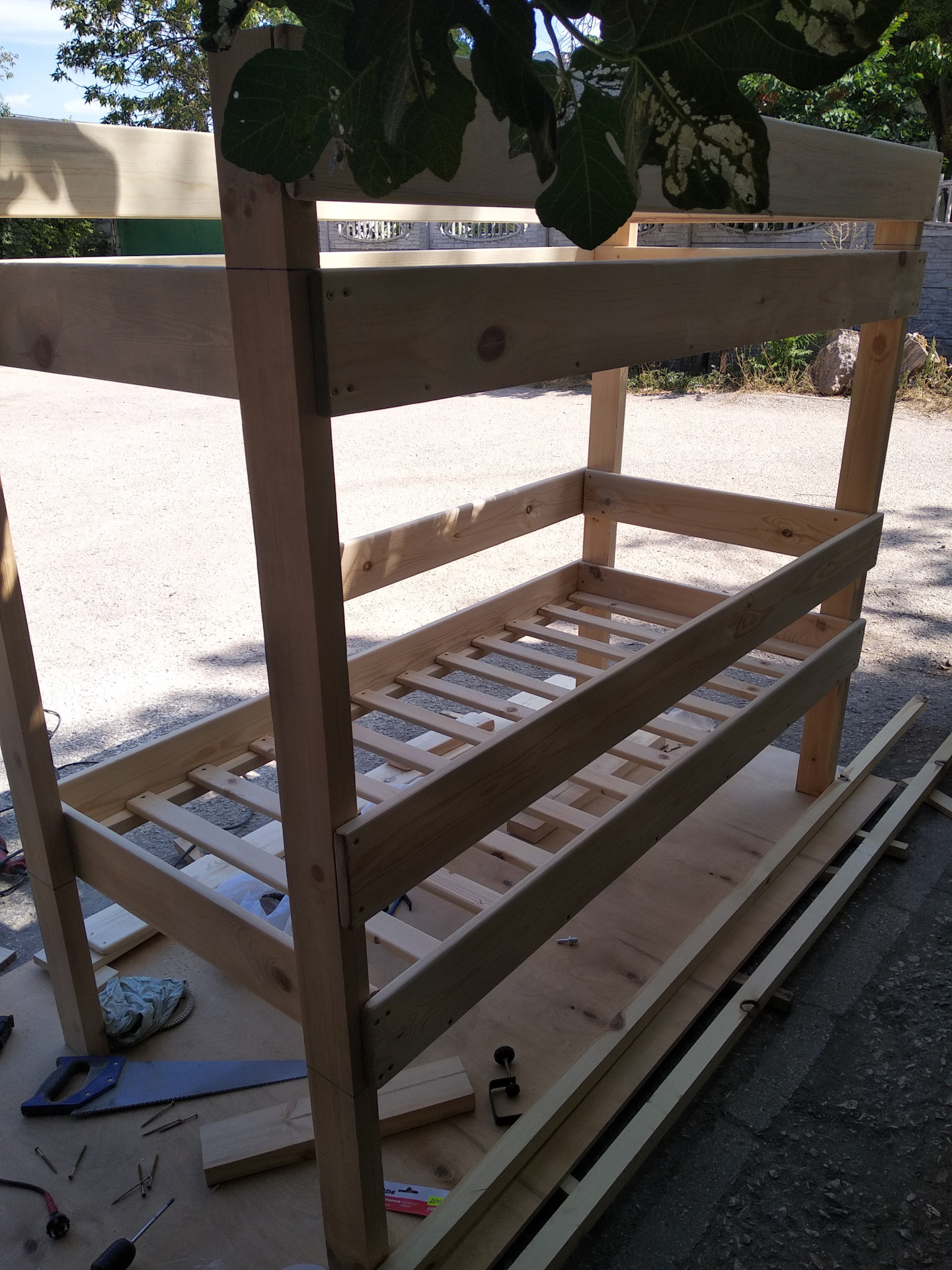 Полки выпиливают из 8-миллиметровой фанеры. Для уменьшения процесса деформации при эксплуатации кровати полки изготавливают из двух кусков фанеры. Причем их размеры подбирают таким образом, чтобы стык находился на поперечном брусе яруса кровати, в соответствии с чертежом.