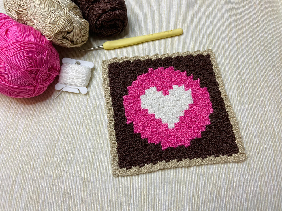 Теперь возьмите желтую пряжу и присоедините нить к середине узкой стороны сердечка. Обвяжите элемент столбиками без накида и провяжите еще один ряд по схеме. В результате вы получите аккуратный квадрат.