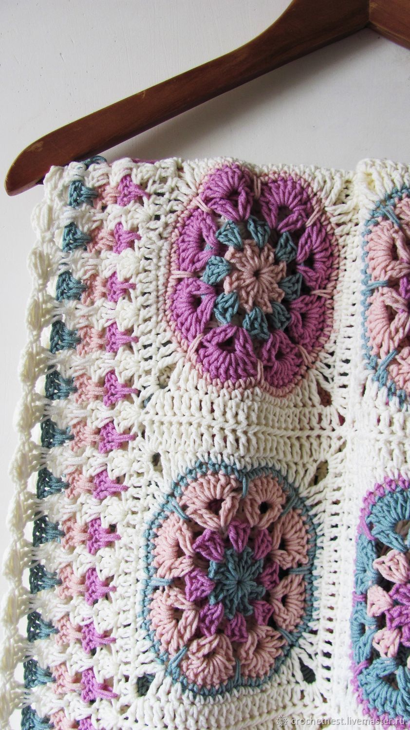 Готовый плед имеет размер 83 х 83 см. Для его создания вам потребуется связать 64 мотива. В представленном проекте использованы два вида квадратов: с цветочным узором и однотонные. Это открывает пространство для творчества — вы можете экспериментировать с цветовыми сочетаниями пряжи на свой вкус.