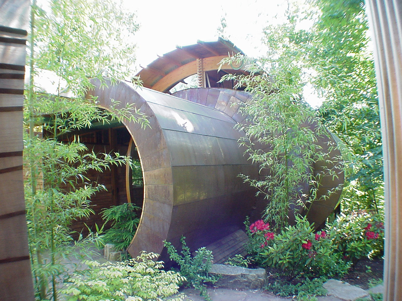 Боковые стены и крыша здания имеют выразительную дугообразную форму, которая выгодно подчёркивает природную текстуру и красоту дерева. Задняя же часть фасада представляет собой искусную комбинацию дерева и стекла. Несмотря на явные отсылки к современному стилю хай-тек, активное использование натуральной, экологически чистой древесины придаёт дому особую теплоту и уют, создавая комфортную атмосферу для жизни.