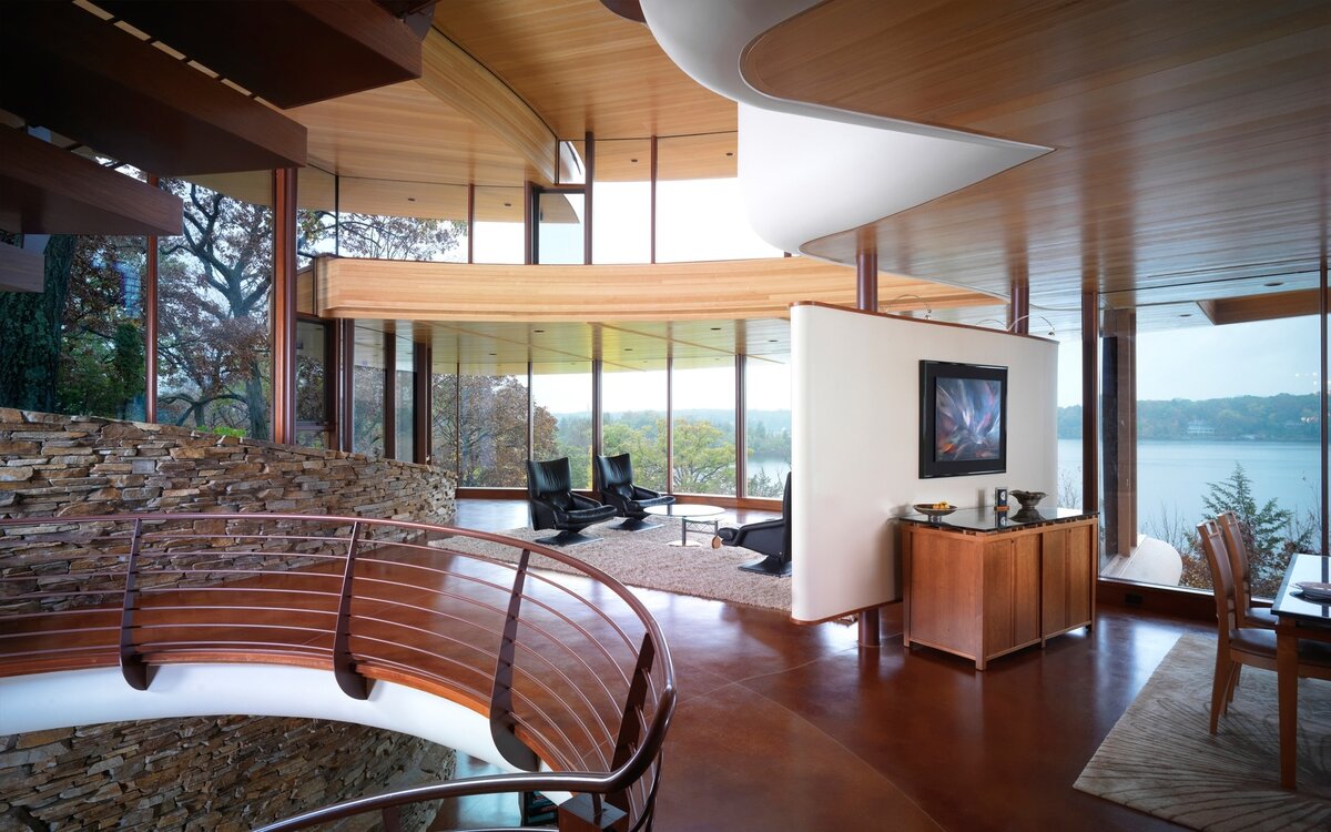 Этот дом, построенный на живописном речном берегу, недавно вызвал ажиотаж в профильных западных изданиях, посвящённых архитектуре и дизайну. Экспертов и журналистов поразила не только его необычная форма, но и смелое решение — одна из фасадных стен полностью выполнена из стекла. Этот приём позволил органично вписать окружающий ландшафт в пространство дома, предоставив его обитателям возможность постоянно наслаждаться прекрасным видом на реку.
