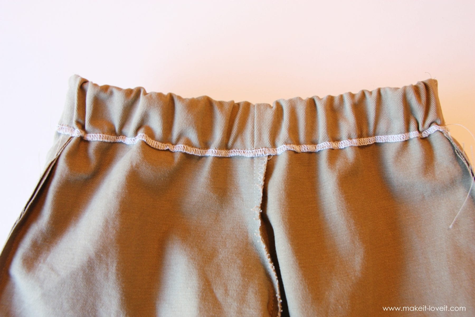 Теперь сложите вместе заднюю и переднюю часть лицевыми сторонами, прошейте вдоль внутренней линии шорт. Затем вдоль обеих длинных сторон обработайте зигзагообразной строчкой швы. Теперь обработайте зигзагом верхний край шорт и загните его, сделайте шов вдоль передней части шорт. Возьмите широкую резинку и вставьте внутрь пояса. Зашейте резинку и прострочите пояс на швейной машинке. Теперь обработайте края штанин зигзагом, загните их и прострочите на машинке.