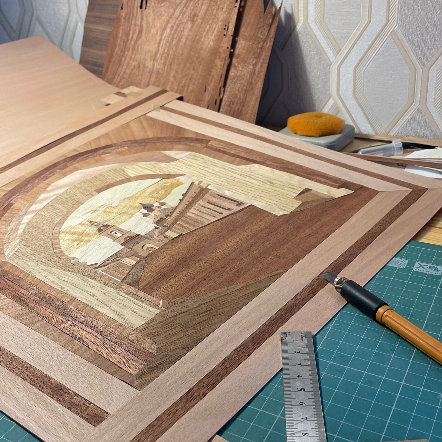 Перед началом резки важно хорошо заточить ножи для маркетри на абразивном камне или бруске, предварительно смочив лезвие водой. Это обеспечит чистый и ровный рез. После этого окончательно подбираем цвета шпона для композиции, начиная с фона.