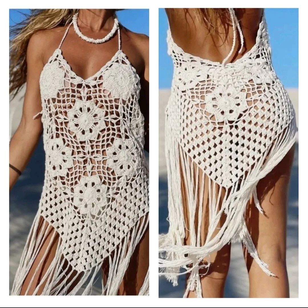 Наше изделие готово, осталось примерить его. Возьмите бретельки в руки, развернув сарафан позади себя, изнанкой к спине. Проденьте в левую бретельку правую руку, а в правую бретельку – левую. Посмотрите на фотографии, по ним легко можно понять, как правильно одеть наш пляжный сарафан. Расправьте его, ткань могла перекрутиться. А теперь полюбуйтесь на себя! Это великолепно! Если Вам кажется, что подол нужно обметать, сделайте это. Я не стала тратить на это время, мне кажется, сарафан и так выглядит потрясающе!