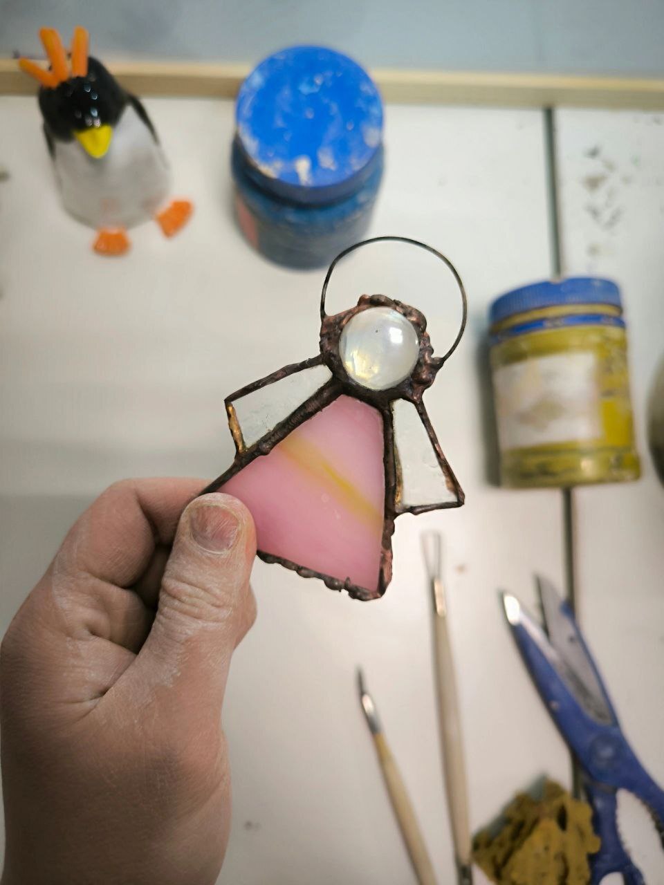 Будьте готовы к затратам: для работы потребуется специальное стекло (опалесцентное, иризирующее), стеклорез, шлифовальная машинка, паяльник, флюс, припой, патина и материалы для обрамления. Процесс сложен и кропотлив. Создается два одинаковых эскиза. Один разрезается на шаблоны, по которым вырезаются детали из разноцветного стекла. Каждый стеклянный фрагмент затем аккуратно оборачивается по периметру медной фольгой.