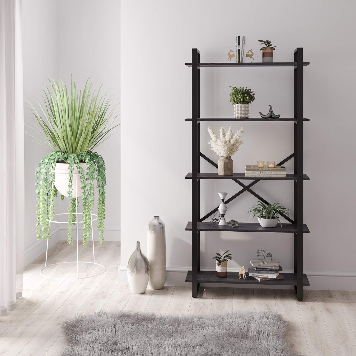 По краям от стеллажей можно повесить обычные книжные полки. На них найдется место для всего: книг, журналов, сувениров, фотографий, посуды и даже комнатных растений. Как видно на иллюстрациях, такой подход сохраняет всю необходимую функциональность, но при этом делает пространство визуально более легким, воздушным и гармоничным.