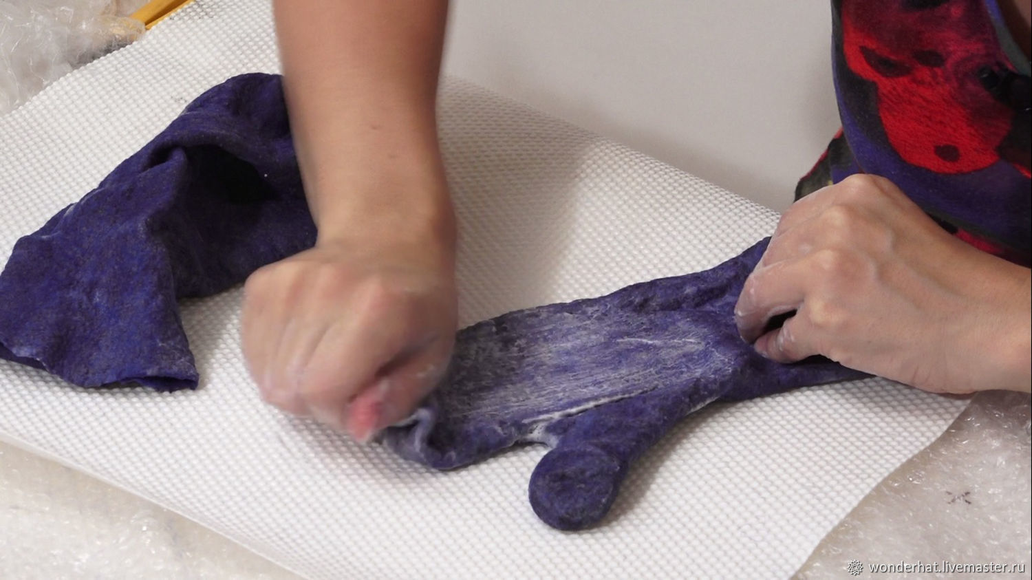 Тщательно смочите всю конструкцию мыльным раствором и накройте сверху еще одним слоем пупырчатой пленки. Активными круговыми движениями разотрите заготовку руками в течение 10 минут, чтобы волокна начали сцепляться.