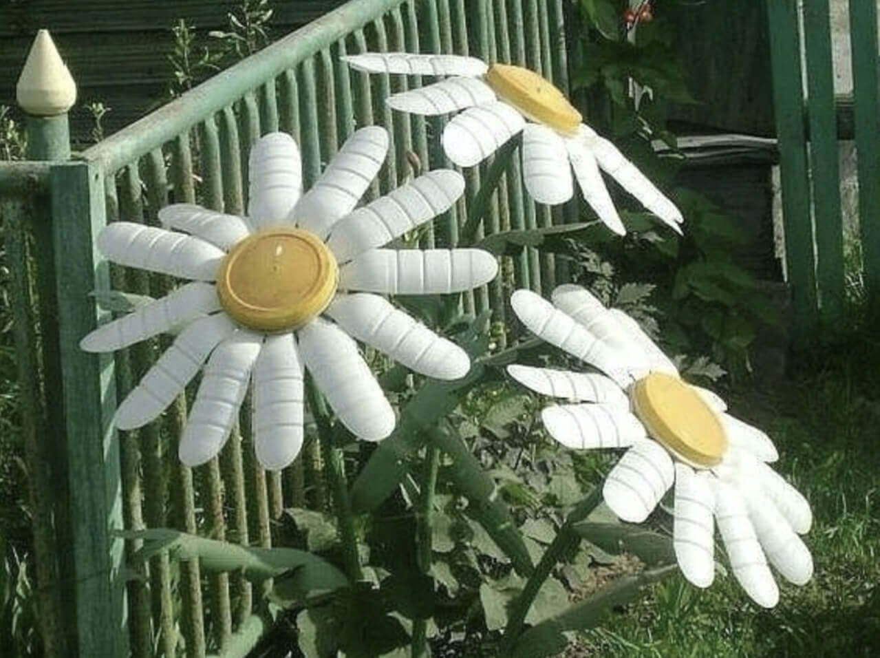 Простор для идей с бутылками поистине безграничен. Из них можно сделать кормушки для птиц, забавные фигурки животных (божьих коровок, зайчиков), мини-клумбы в виде хрюшек или просто использовать их как яркое ограждение для цветника.