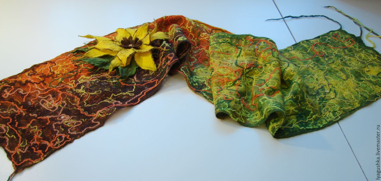 Крейзи-вул также отлично сочетается с техникой валяния. Например, чтобы сделать тёплый шарф, подготовьте: шерсть для валяния, вискозу для декора, мыльный раствор, подложку, маркер, скалку и виброшлифовальную машинку (ВШМ).