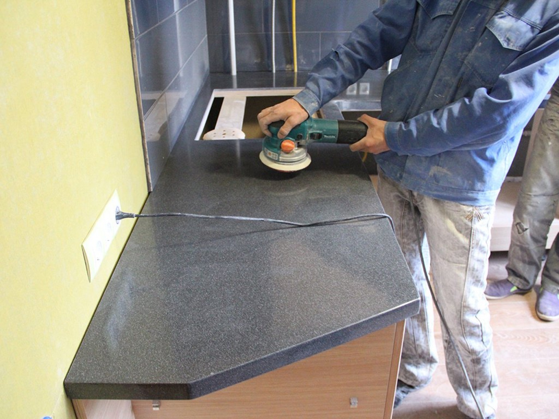 - Обработка стыков: Если столешница состоит из нескольких частей, места соединения нужно обезжирить, промазать герметиком, а после стяжки аккуратно зашлифовать.