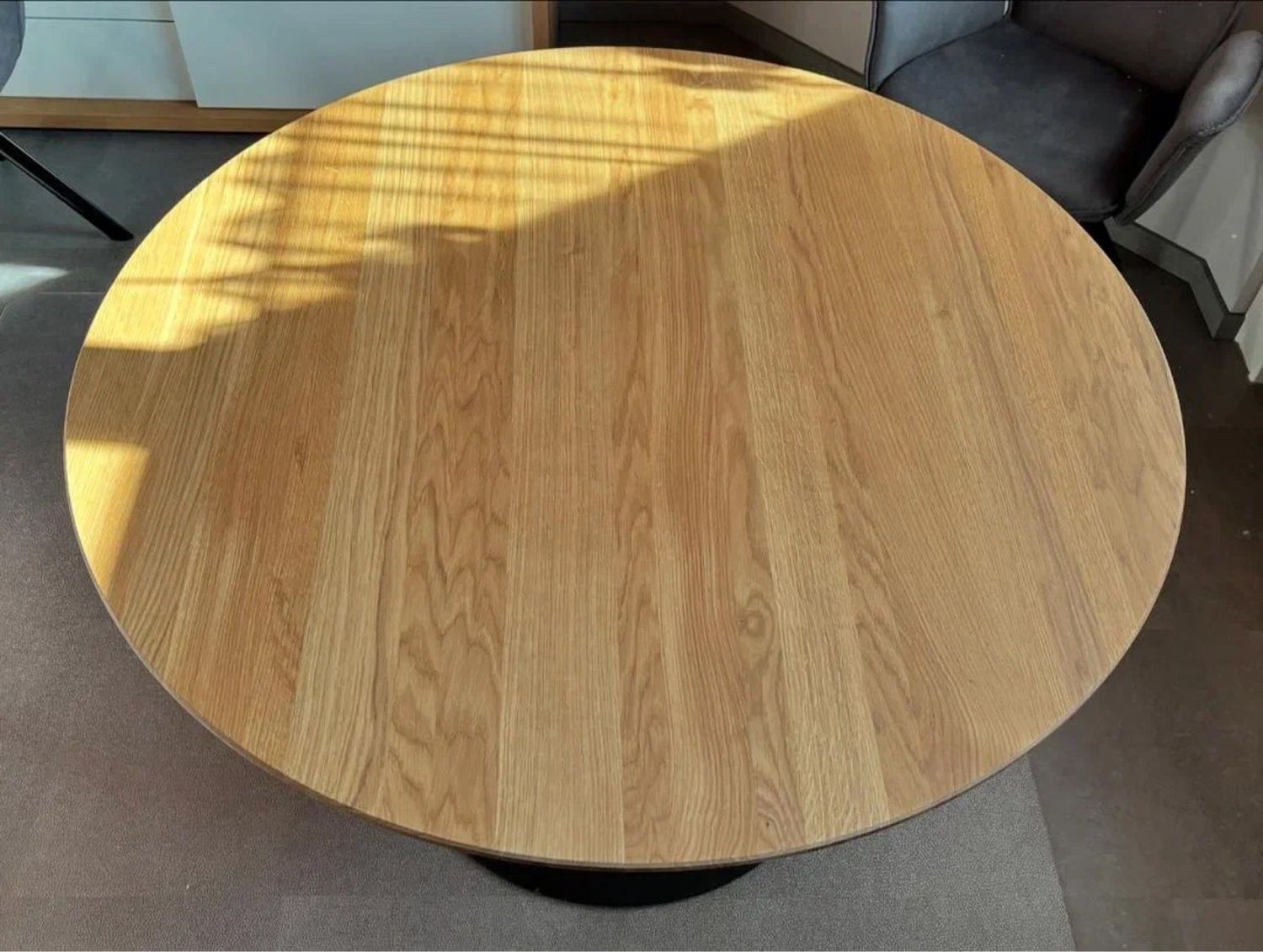 Большой круглый стол станет отличным решением для просторной кухни-гостиной или столовой. Он не только функционален для семейных обедов, но и готов к приему большой компании.