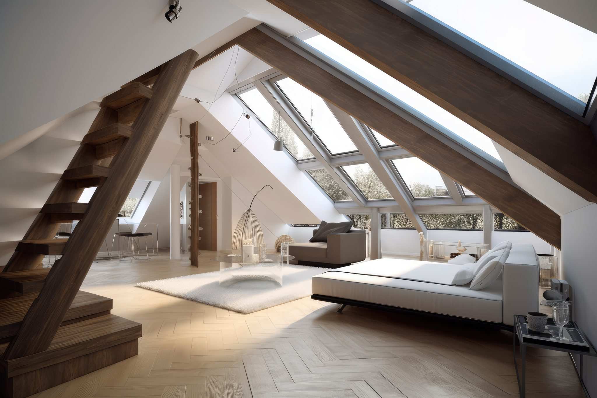 Лестница ведет в основную зону квартиры, которая сразу поражает обилием света. Деревянная отделка пола и потолка добавляет интерьеру тепла и современного шарма. Пространство организовано как единое целое: гостиная и столовая плавно перетекают в кухонную зону с барной стойкой. Доминирующий белый цвет визуально расширяет помещение и усиливает ощущение простора.