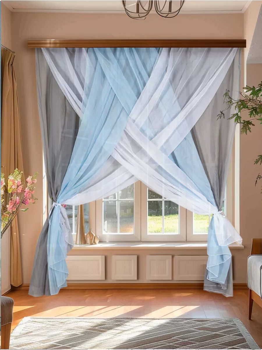 Занавески из лёгкой вуали — это популярный и элегантный способ оформления окон, который подходит для большинства помещений. Их главные преимущества — универсальность и широкий выбор дизайнов. Богатая палитра расцветок и узоров позволяет идеально вписать вуаль в любой стиль интерьера. Проявив немного творчества, можно создать уникальную композицию, комбинируя несколько полотен, что превратит обычное окно в центральный элемент декора комнаты.